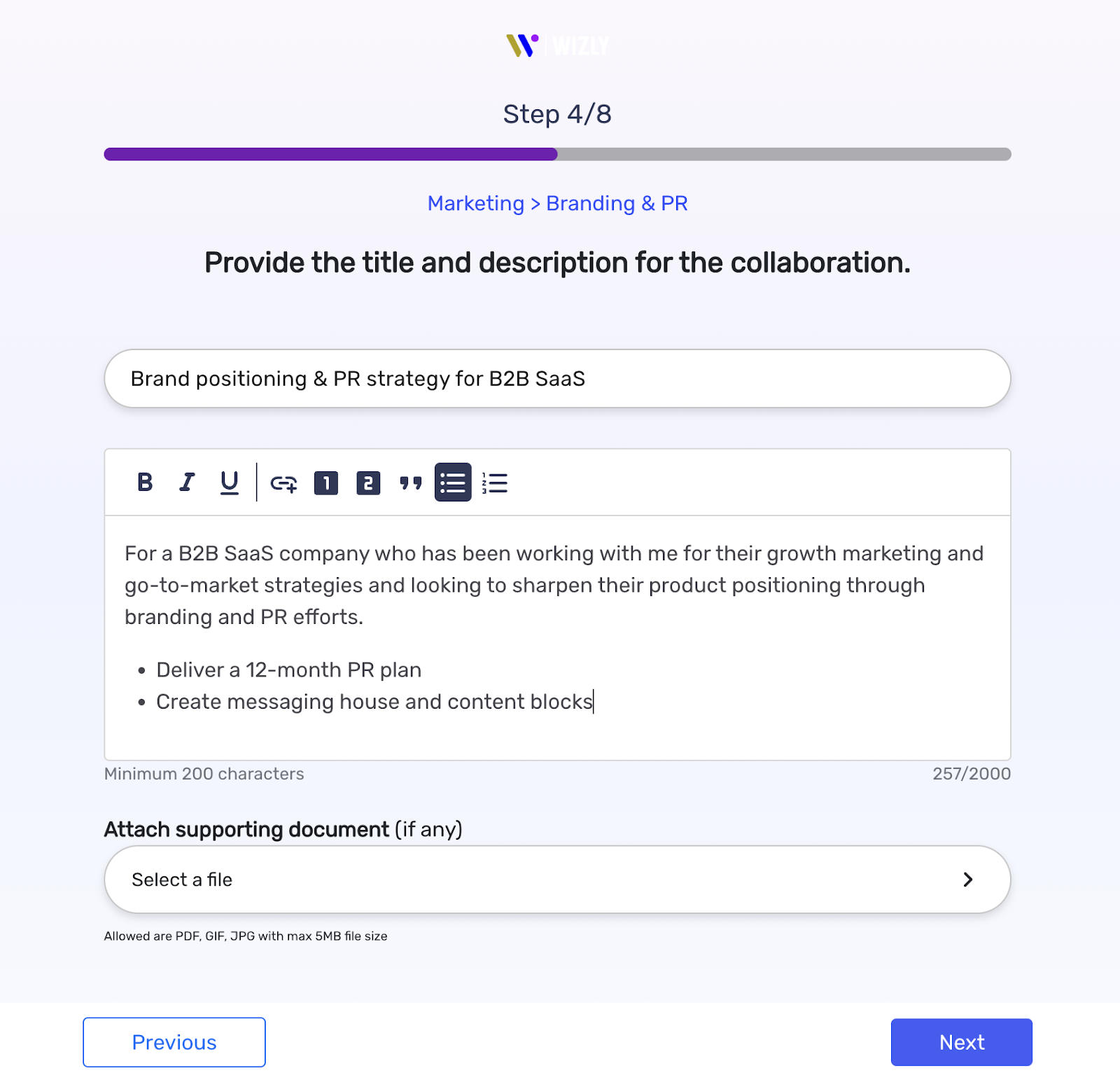 By following these steps, you can easily post a collaboration on your smart marketplace and start connecting with other independent professionals who can help make your project a success. Whether you're working on a marketing, product development, or talent management project, Wizly makes it easy to find the right people to collaborate with.